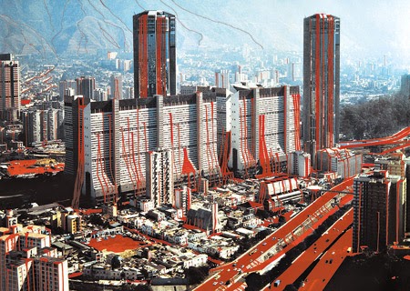 Una ciudad desde lo alto, de costado, un pedazo de una ciudad que se sabe que es Caracas. El título de la foto lo indica y de paso la describe: Caracas sangrante. Pintada digitalmente con ríos de sangre que brotan y caen desde rascacielos, que crecen para intentar la altura de los cerros del valle que los contiene. Chorreados y trazos rojos con rigidez de pixel, el derrame de líquido vital en la vida de cemento, todo casi de ficción, menos los miles de muertos ocultos de tan expuestos.